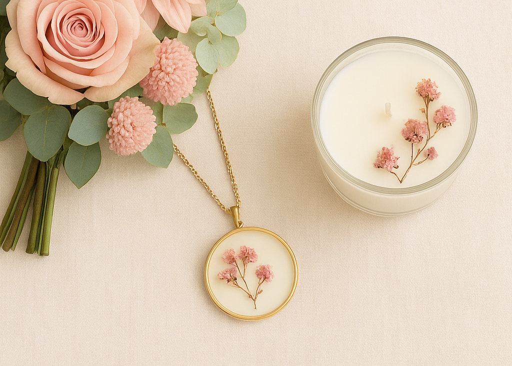 Tus damas de honor, amigas o hermanas merecen algo más que un simple detalle. Este pack combina una vela y una joya inspiradas en tu ramo, creadas para que cada una guarde un pedacito de vuestro día.