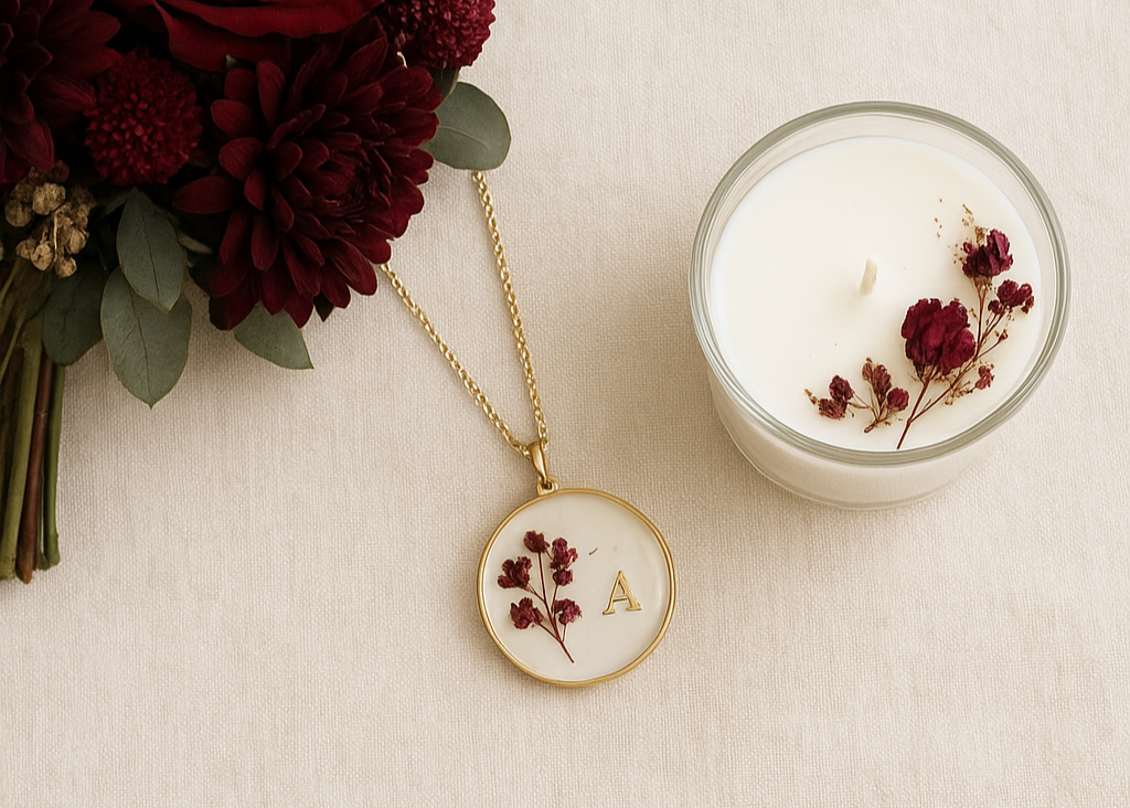 Tus damas de honor, amigas o hermanas merecen algo más que un simple detalle. Este pack combina una vela y una joya inspiradas en tu ramo, creadas para que cada una guarde un pedacito de vuestro día.